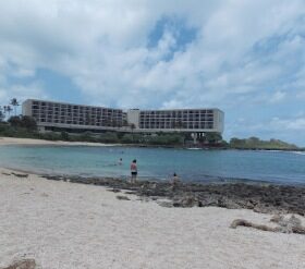 We arrived at the resort around 2 pm. There was not much of a check-in line yet and either way, the hotel had its dedicated elite status check-in line. The front desk agent upgraded us to Ocean-Front room from resort-view room in the Rainbow Tower. We were also given the option of 1,000 Hilton Bonus points per stay OR a $10 daily dining credit to use in participating restaurants and bars onsite for me and up to one guest for each day of your stay. We chose the dining credit.