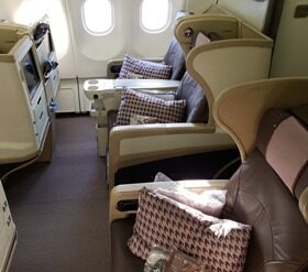 Seat Specification: Full Lie Flat, 180 degree recline, Seat pitch: 80.4″. Seat width: 21.3 ”