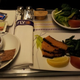 Flight: Thai Airways TG 313 from Bangkok to Kolkata Aircraft: A333 (Airbus 330-300) Class: Business Seat: 14 E, Middle Aisle Seat Specification: Recliner, 138 degree recline, Seat pitch: 50 “. Seat width: 20 ” Thai Airways operates an Airbus 300 on this short-haul route between Bangkok and Kolkata. The flight time is only around 2 hours 30 minutes so a recliner seat gets the job done here. Right after boarding, I was offered pre-departure beverage of orange juice/grape juice/water. No champagne? Bummer !! Karen: They offered us champagne for pre-departure beverage. Maybe the wheels came off the wagon on my husband’s flight. Next came …